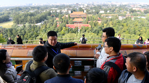 當日,十九大新聞中心組織首場外出參觀采訪活動,25家境內(nèi)外媒體35名記者,沿著北京中軸線參觀了永定門城樓、景山、鐘鼓樓、奧林匹克塔等經(jīng)典建筑,了解古都北京的歷史沿革,感受黨的十八大以來古都煥發(fā)出的生機活力。