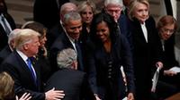 小布什走向賓客的座位時,左手伸進西裝口袋拿東西。他與奧巴馬握完手后,將左手中的糖果放至右手,才伸出右手與米歇爾握手,并將手中的糖果塞給她。
