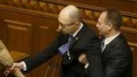 當地時間11日,烏克蘭最高拉達(議會)發生一起國會議員斗毆事件,肇因于烏總理亞采紐克在發表政府年度工作報告時被一名議員抱離發言席。