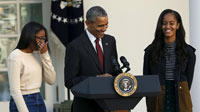 美國總統奧巴馬11月25日照往例在感恩節前夕赦免了火雞“亞伯”。他還講了雙關語笑話,感慨任期將至火雞不飛、但時光飛逝,把兩個女兒和在場賓客逗得大笑。