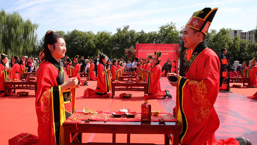 國(guó)慶節(jié)上午,在西安漢城湖封禪廣場(chǎng)舉辦了一場(chǎng)“戊戌年漢式集體婚禮”。
