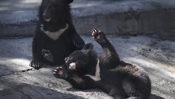 熊孩子的日?!捌堋?俄羅斯動物園里的亞洲黑熊幼崽