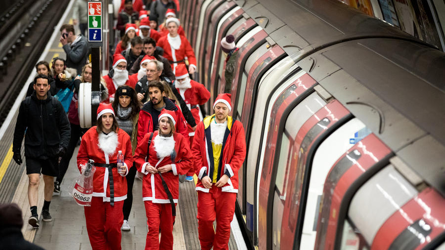 當(dāng)?shù)貢r(shí)間2017年12月3日,英國倫敦,倫敦圣誕老人慈善跑活動(dòng),男女老少圣誕裝穿越地鐵。