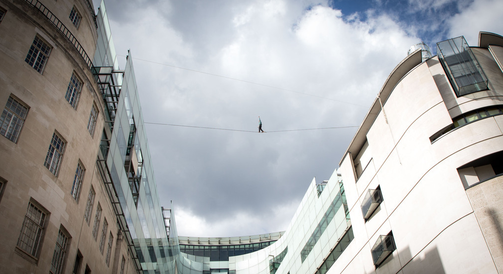 英國男子BBC大樓上演驚險一幕 赤腳高空走鋼絲