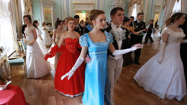 當(dāng)?shù)貢r(shí)間2017年3月15日,俄羅斯圣彼得堡,圣彼得堡年輕人在康斯坦丁宮舉辦復(fù)古舞會(huì),重現(xiàn)經(jīng)典《戰(zhàn)爭與和平》19世紀(jì)場景。