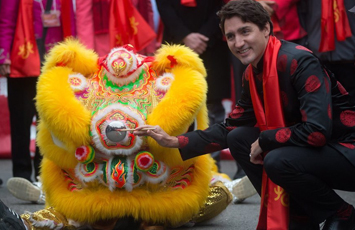 加拿大總理特魯多身著唐裝參加春節游行 撫摸舞獅頭激萌十足