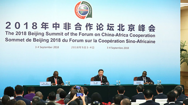9月4日,2018年中非合作論壇北京峰會(huì)閉幕后,國(guó)家主席習(xí)近平同論壇前任共同主席國(guó)南非總統(tǒng)拉馬福薩、新任共同主席國(guó)塞內(nèi)加爾總統(tǒng)薩勒在北京人民大會(huì)堂共同會(huì)見記者。習(xí)近平指出,中非領(lǐng)導(dǎo)人一致同意,攜手打造責(zé)任共擔(dān)、合作共贏、幸福共享、文化共興、安全共筑、和諧共生的中非命運(yùn)共同體。