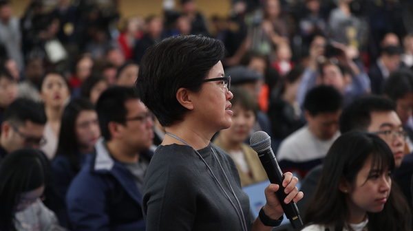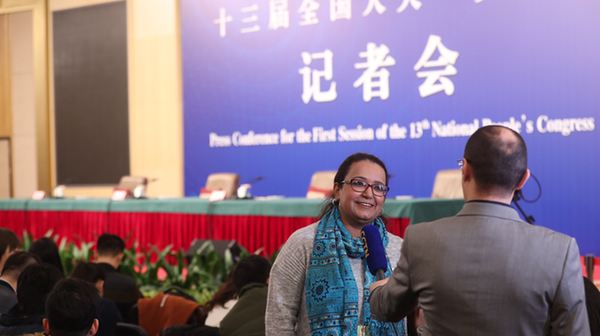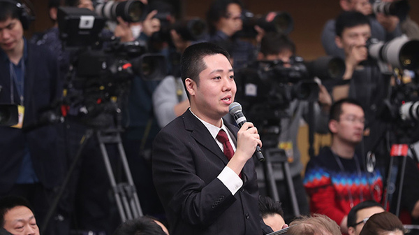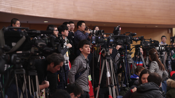 十三屆全國(guó)人大一次會(huì)議新聞中心3月8日上午10時(shí)在梅地亞中心多功能廳舉行記者會(huì),邀請(qǐng)外交部部長(zhǎng)王毅就“中國(guó)外交政策和對(duì)外關(guān)系”回答中外記者提問。圖為記者在現(xiàn)場(chǎng)采訪。