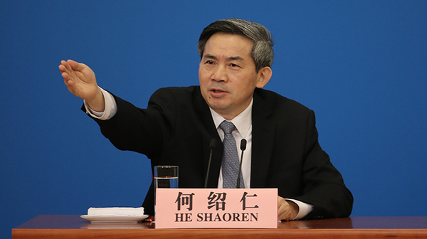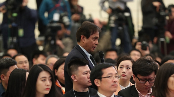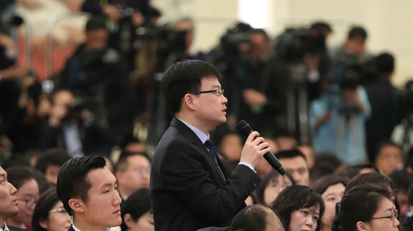 3月20日上午,十三屆全國人大一次會議閉幕后,國務院總理李克強將在人民大會堂三樓金色大廳會見采訪十三屆全國人大一次會議的中外記者并回答記者提出的問題。圖為記者會主持人何紹仁。