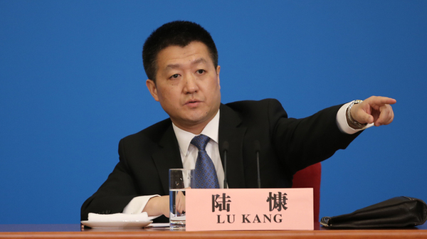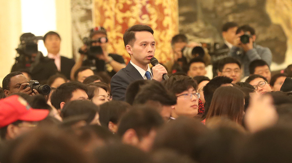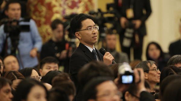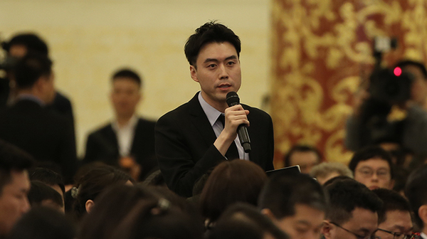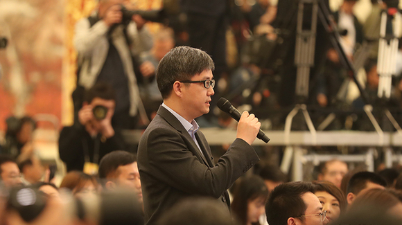 3月20日上午,十三屆全國人大一次會議閉幕后,國務院總理李克強在人民大會堂三樓金色大廳會見采訪十三屆全國人大一次會議的中外記者并回答記者提出的問題。圖為記者會主持人陸慷。