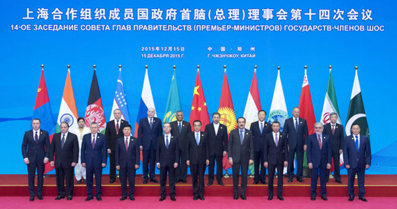 15日上午,李克強(qiáng)總理在鄭州國(guó)際會(huì)展中心與出席上海合作組織成員國(guó)政府首腦(總理)理事會(huì)第14次會(huì)議的成員國(guó)、觀察員國(guó)領(lǐng)導(dǎo)人和國(guó)際組織負(fù)責(zé)人集體合影。